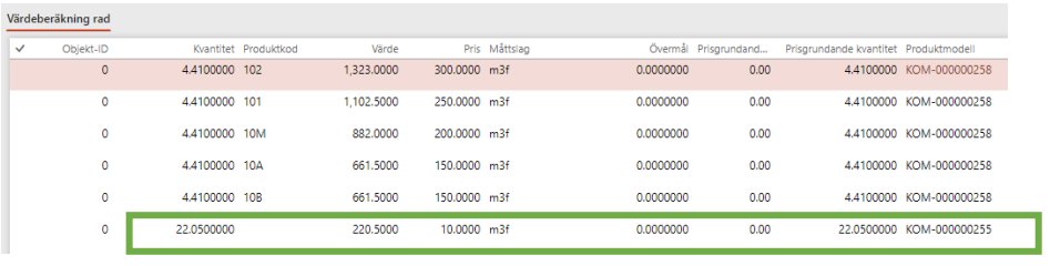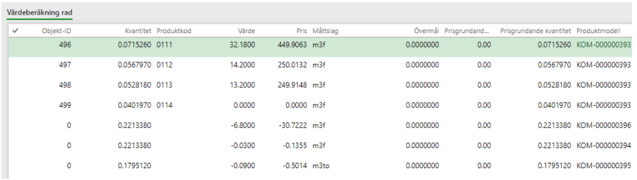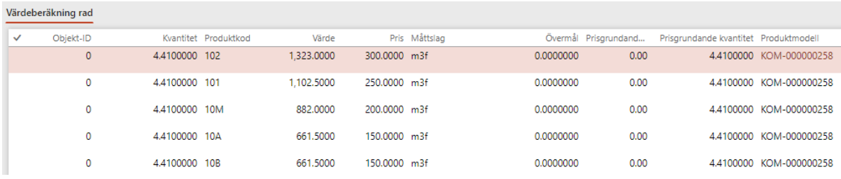 Värdeberäkning av 3 travar (prima, sekunda, utskott), där respektive trave (objekt) har en Objekt-ID. Inga tillägg/avdrag. Värdet faller ut per handelssortiment, per trave och baserar sig på klass (prima/sekunda/utskott). Värdeberäkningen är ej uppdelad per produkt, därav tomt i produktkod.