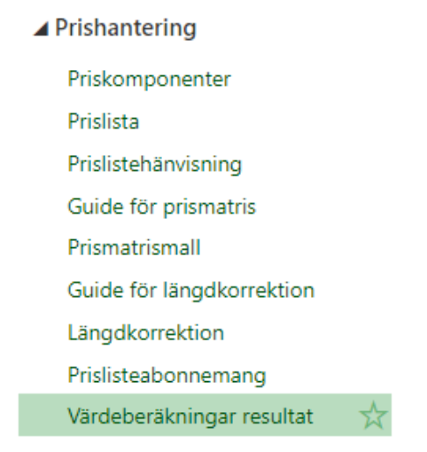 För att kunna ta del av resultatet från din värdeberäkning finns i nuläget, innan kompletta rapporter i Power BI, en vy ”Värdeberäkningar resultat” tillgänglig för dig som prisadministratör. Observera att Värdeberäkningar resultat är en temporär lösning varför det inte är möjligt att lämna synpunkter eller önskemål. Värdeberäkningar resultat nås via: