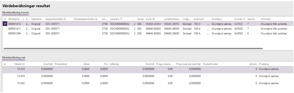 - Om värdeberäkning sker med prislista, säkerställ att rätt prislista och rätt version av prislista hittats.