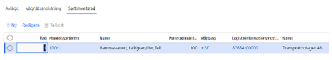 - Finns det en LIM (Transportbolaget AB), på avtalsobjektet och transportinstruktioner är skapade. Byter du LIM från Transportbolaget AB till Transport på sortimentrad avtalsobjektet, skickas inte den befintliga