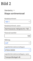 Rad 2: LIM: Transport får den planerade kvantiteten (50 m3f) och skördarrapportering och skotarrapportering på Handelssortiment 011-1. Transport kommer inte få planerade volymer, skördade och skotade volymer 100-2 (Rad 1).