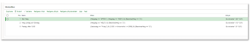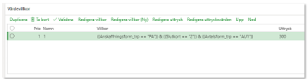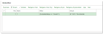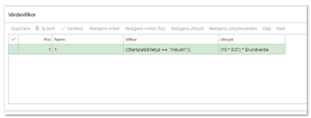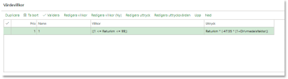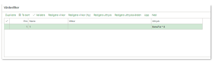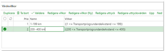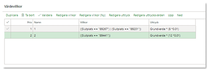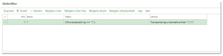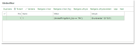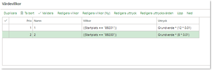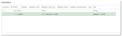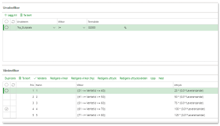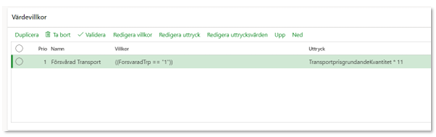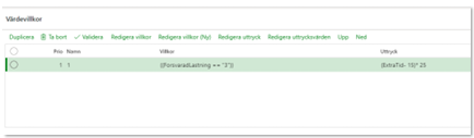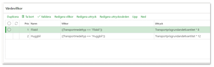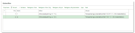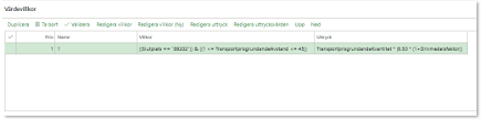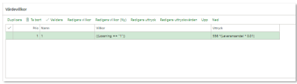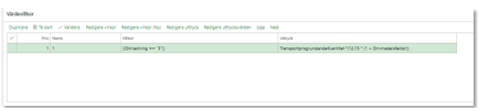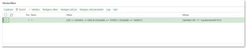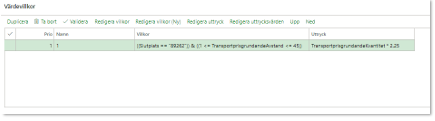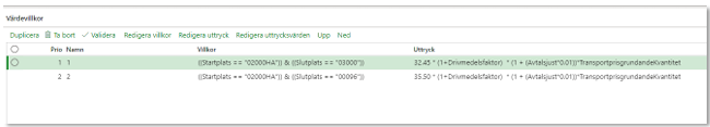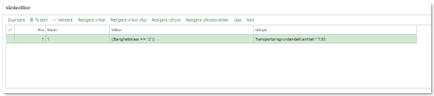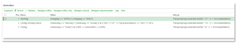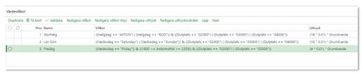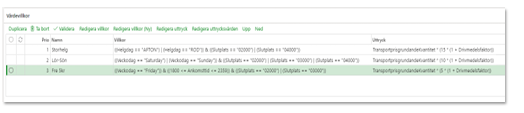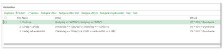 Den första raden visar att om det är en storhelg skall det falla ut ett tillägg på 17% av grundpriset. Rad två kommer att ge ett tillägg på 15 % av grundpriset om leveransen infaller på en lördag eller söndag. Användaren vill att på rad tre att om veckodagen är en fredag och ankomsttiden är mellan 1800–2359 (viktigt att skriva tidsformatet som visas innan) ska ett tillägg på 10% av grundpriset ska falla ut.