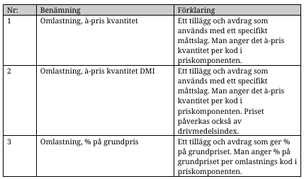 OBS. Komponenter kopplade till Övervikt sätts in under kvantitetsrader i befraktarkontraktet till skillnad från övriga komponenter som läggs in på transportprislistan.