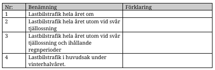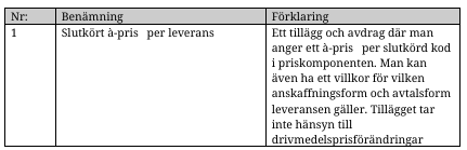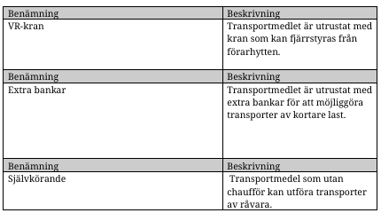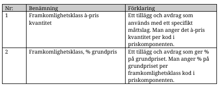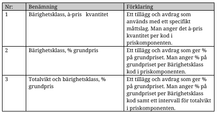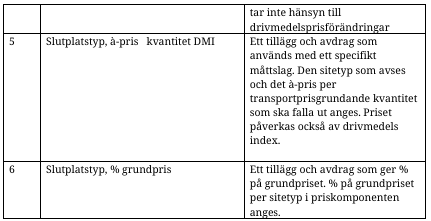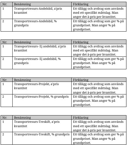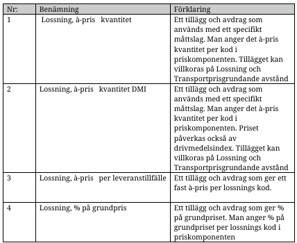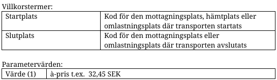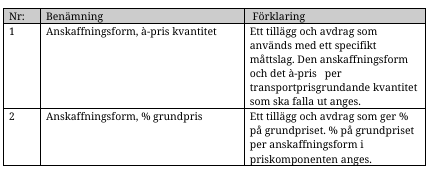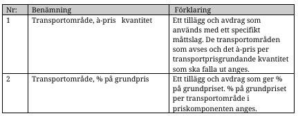 - Underlag transportuppgifter - samlas in från mätplats eller via underlag transportuppgifter i leveransavisering, dessa uppgifter kan vara prisgrundande om sådana komponenter finns i aktuell prislista.
