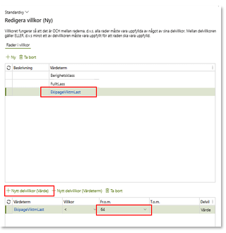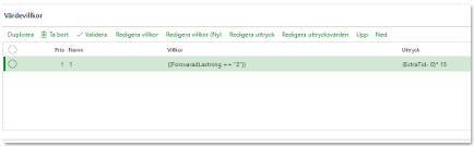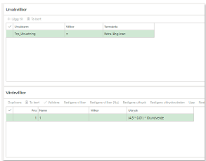 OBS: Viktigt att tänka på när skapar komponenter med villkor som innehåller termer med AFTON och ROD är att lägga dem högst upp i villkorsprioriteringen. Detta för att undvika att ett tillägg skulle falla ut för tex en lördag eller söndag om en Julafton eller Juldag skulle infalla på de veckodagarna.