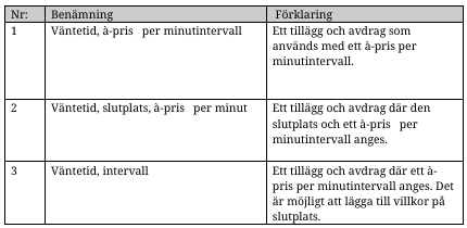 Väntetidskomponenterna läggs till under övriga T/A. Komponenterna utlöses primärt av tiden mellan starttid och sluttid på mätplatsen, på redovisad mätning på leveranstillfället. Det finns tre olika priskomponenter, Väntetid, à-pris per minut och Väntetid, slutplats, à-pris per minut där det är möjligt att lägga in ett villkor på vilken slutplats som avses och Väntetid intervall där det är möjligt att lägga in ett villkor på vilken slutplats som avses. Vid samlast ska tillägget falla ut i förhållande till leveransens andel av leveranstillfälle.