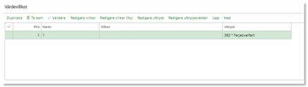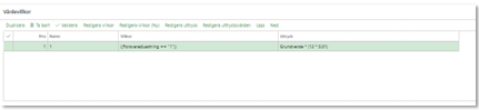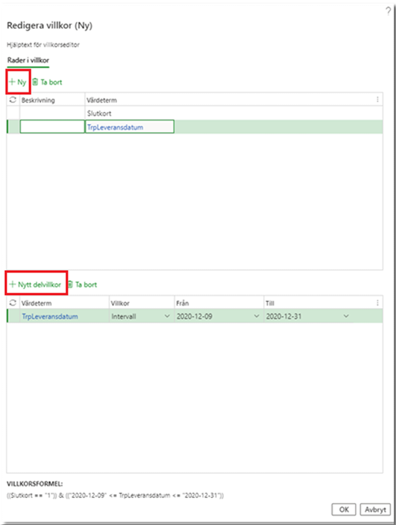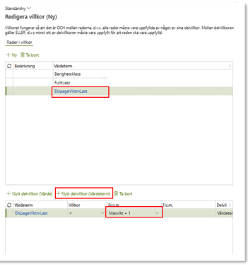 Den nya värdetermen kan sedan läggas in under ”Redigera villkor. Samt under (+Nytt delvillkor). För att använda Leveransdatum på Övervikt och lastutfyllnads så beskrivs detta mer utförligt under respektive komponent.