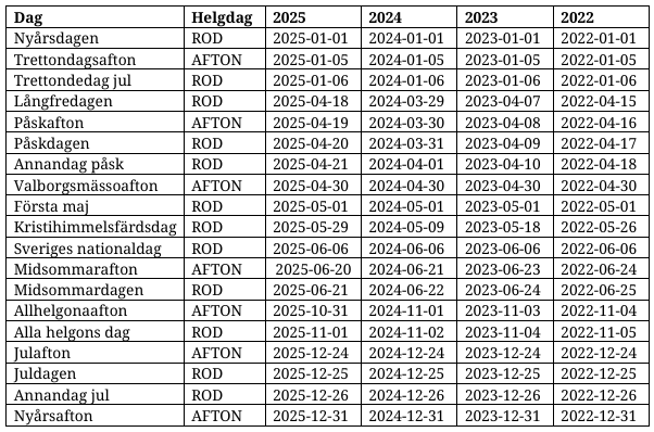 Måndag-fredag är vardag (VARD), lördag-söndag är helg (HELG) förutom nedanstående dagar som i systemet är definierade som helgdagsafton (AFTON) respektive helgdag (ROD).