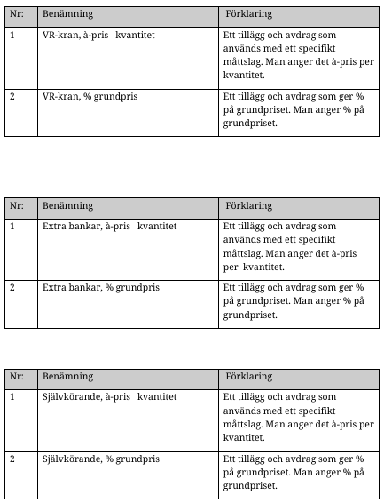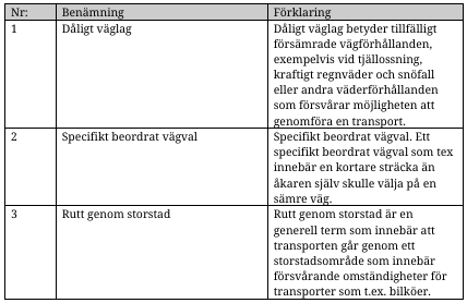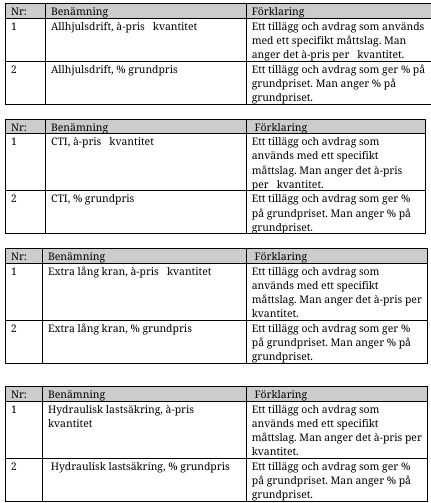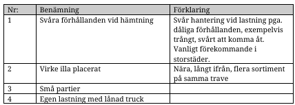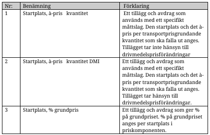 Användaren önskar att kod 1: ”Svåra förhållanden vid hämtning” ska ge ett tillägg med ett à-pris på 12,15 SEK per transportprisgrundande kvantitet. Och att virke illa placerat = kod 2 ska ge ett à-pris 18,00 SEK per transportprisgrundande kvantitet. À-priset ska vid prisräkningstillfället räknas upp med aktuell drivmedelsfaktor. Samma à-pris ska gälla oavsett transportavstånd.