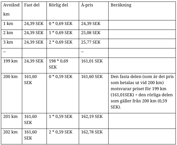 Den första varianten beräknas utifrån ett á-pris, som består av en fa st del och km avstånds-beroende del, per transportprisgrundande kvantitet.