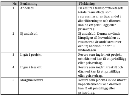 Transportresurs avser koder som används för att beskriva en särskild användning av ekipaget, chaufförens roll/kompetens eller andra speciella omständigheter vid utförande av ett transportuppdrag. Flera värden för transportresurs kan anges på en leverans i mätplatsstödet. De används för att lösa ut tillägg/avdrag i transportprislistor.