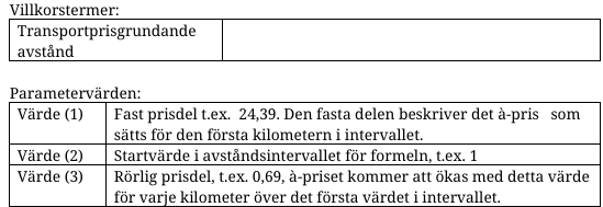 Användaren önskar att grundpriset för transportavstånd mellan 1–199 km ska vara 24,39 SEK för den första kilometern och därefter en ökning med 0,69 SEK per kilometer. För transportavstånd mellan 200–400 km ska ökningen vara 0,59 SEK per kilometer.