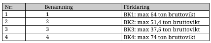 Om den tillåtna maxvikten är 64 ton vägens bärighetsklass är en BK4 (74 ton) och leveranstillfällets vikt är 58 ton så faller det ut 64-2-58=> 4 ton som lastutfyllnad.