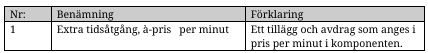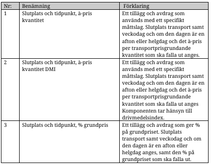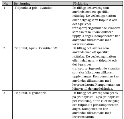Rad ett visar att om det är en storhelg skall ge ett tillägg på 17 SEK per transportprisgrundande kvantitet falla ut. Rad två kommer att ge ett tillägg om veckodagarna är lördag eller söndag mellan datumen 2021-11-01 och 2021-11-30. Då skall ett tillägg falla ut på 15 SEK per transportprisgrundande kvantitet. Rad tre visar att om ankomsttiden är mellan 1800–2359 (viktigt att skriva tidsformatet som visas innan) och veckodagen är en fredag ska ett tillägg på 8 SEK per transportprisgrundande kvantitet falla ut. Det finns två olika komponenter för Tidpunkt, à-pris kvantitet, den första tar inte med drivmedelsindex i sin värdeberäkning den andra tar med detta och justerar priset efter aktuellt drivmedelsindex.