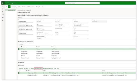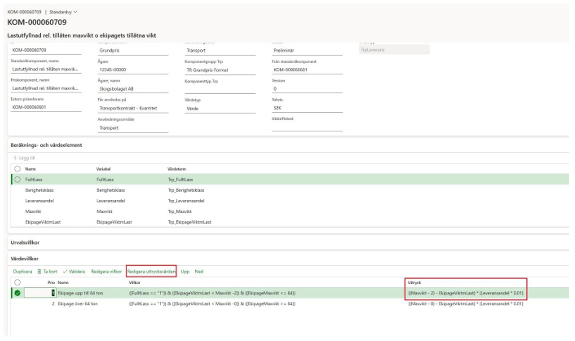 Användaren vill att om leveranstillfällets vikt är mindre än det fasta gränsvärdet och vägens bärighetsklass är korrekt och att ekipagets maxvikt är upp till NN ton så skall lastutfyllnad falla ut och kvantiteten på leveransen justeras upp till det fasta gränsvärdet. Användaren har två typbilar med maxvikt 64 ton respektive 74 ton. För typbilar 64 ton ska lastutfyllnad falla ut upp till 62 ton. Detta ska gälla för transporter både på BK1 och BK4 väg. För typbilar 74 ton ska lastutfyllnad upp till 64 ton falla ut om transporten gått på BK1 väg. Om transporten gått på BK4 väg ska lastutfyllnad upp till 72 ton falla ut. Komponentens alla rader har även ett villkor på datum. För att ange gränsvärdet eller förändra bärighetsklass och ekipagets maxvikt i villkor måste ”Redigera villkor” användas. Observera att gränsvärdet måste sättas in både som uttrycksvärde och i villkoret för att komponenten ska fungera korrekt.