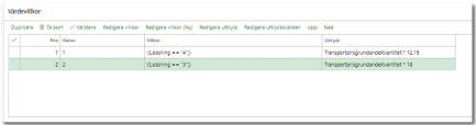 Användaren önskar att ge ett tillägg på 12 kr per transportprisgrundande kvantitet för transporter som sker i transportområdet ”Nord”. Transportområde ”Mellan” ger ett avdrag på 2 kr per transportprisgrundande kvantitet.