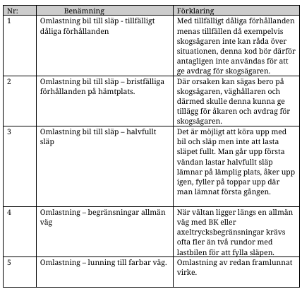Koderna kan anges i transportunderlag, tranportinstruktion och de flesta i Leveransavisering eller vid mätning. Koderna som anges i Tranportunderlag och i transportinstruktion fungerar endast som information och påverkar inte prisräkningen av transporten. Anges koderna i leveransavisering, transportstatus eller vid inmätning och det finns tillägg och avdrags komponenter för dessa koder på en transportprislista kommer de användas för prisräkning. Koderna är kopplade till de Tillägg och Avdragskomponenter (T/A) som redan är skapade eller kommer att skapas i framtiden.