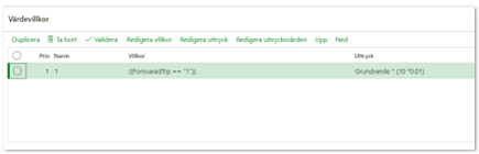Priskomponenten kan skapas och sättas upp med önskad tolerans. Observera att toleransen måste sättas in både som uttrycksvärde och i villkoret för att komponenten ska fungera korrekt.