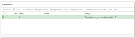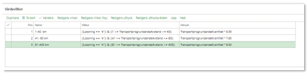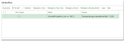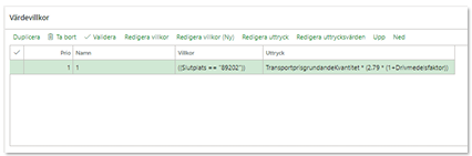 Användaren vill att på rad 1 att en Storhelg skall ge ett tillägg på 15 SEK per transportprisgrundande kvantitet och att det skall gälla för slutplatserna 02000 eller 04000. Rad 2 beskriver att veckodagen är en lördag eller söndag och att slutplatserna är 02000 eller 03000 eller 04000 och ger då ett tillägg på 10 SEK per transportprisgrundande kvantitet. Rad 3 beskriver att om dagen är en fredag och att ankomsttiden är mellan 1800 och 2359 (viktigt att man skriver tiden i formatet som visas) samt att slutplatsen är 02000 eller 03000 och detta ger då ett tillägg på 5 SEK per transportprisgrundande kvantitet. Det finns två olika komponenter för Slutplats transport och tidpunkt a pris kvantitet, den första tar inte med drivmedelsindex i sin värdeberäkning den andra tar med detta och justerar priset efter aktuellt drivmedelsindex.