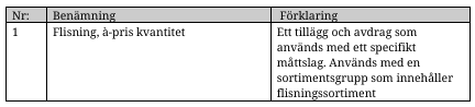 Användaren vill att flisning skall redovisas som en separat post i resultatet. Användaren vill att ett tillägg skall falla ut för flisning för ett specifikt flisningssortiment och måttslag och transportmedelstyp. Rad ett visar att ett tillägg skall falla ut för flisning om transportmedelstypen är en flisbil, på 8 SEK per transportprisgrundande kvantitet. Rad två visar att ett tillägg skall falla ut för flisning om transportmedelstypen är en huggbil, på 12 SEK per transportprisgrundande kvantitet