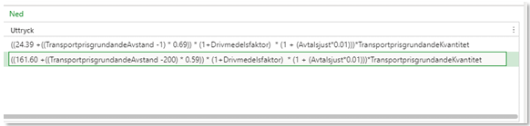 Formel (Värde (1) +((TransportprisgrundandeAvstand -Värde (2)) * Värde (3)) * (1+Drivmedelsfaktor) * (1 + (Avtalsjust*0.01)))*TransportprisgrundandeKvantitet