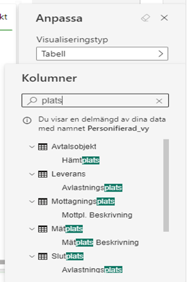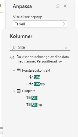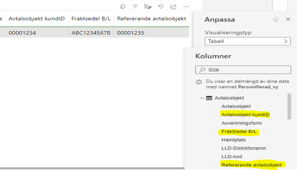 Vår Resultat bild nedan innefattar de slicer val som finns som standard vid start av rapporten. Kolumnvalen har vi lagt till genom att ändra/lägga till Attribut i - Anpassa det här visuella objektet.