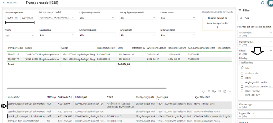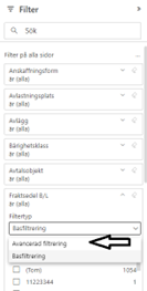Det som har tillkommit i transportsedel är tillval av två kolumner fritext och fraktsedel B/L i den nedre tabellen samt visuellt filter.
