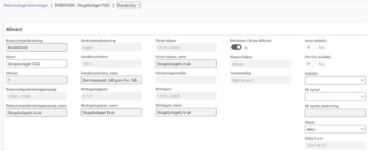 I redovisningshänvisningen behöver du uppge en befraktare, fast den inte har någon funktion när det är ”nej” på att initiera transportaffär (Bild 12).