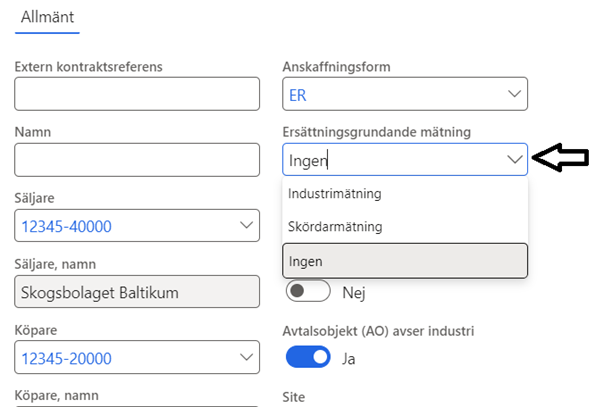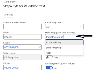 På första förstaledskontraktet ska du fylla i om ersättningsgrundande mätning avser råvaruaffären. Där väljer du ”industrimätning” (Se bild 1).