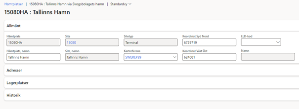 När du väljer vilken Site på Förstaledskontraktet, (se bild 3) kommer landet följa med från lagerstället/hämtplats/mottagningsplats som är upplagd under den siten. (Bild 4)
