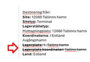 - Avgångshamn/Ankomsthamn (koordinaterna ligger i avgångshamnen, och på lagerplatsnivå ligger koordinaterna på ankomsthamn)