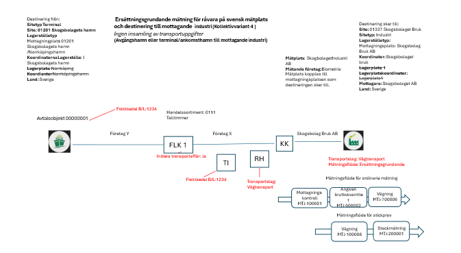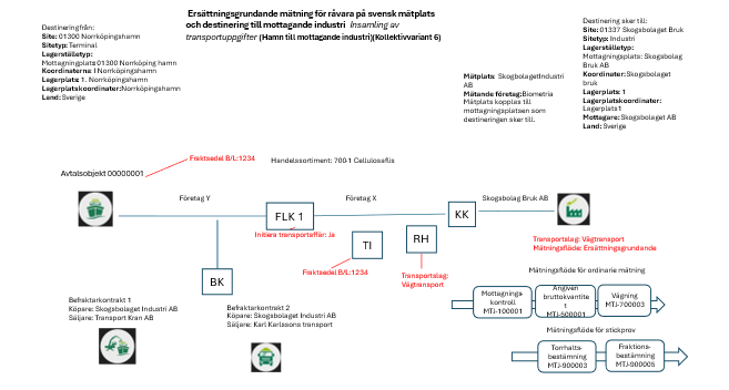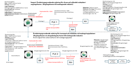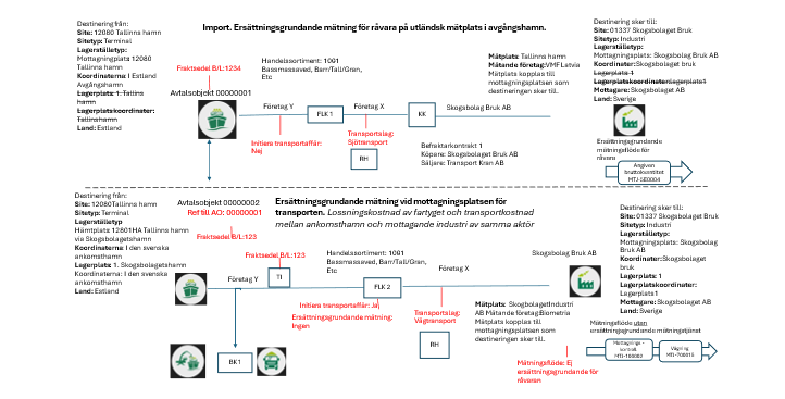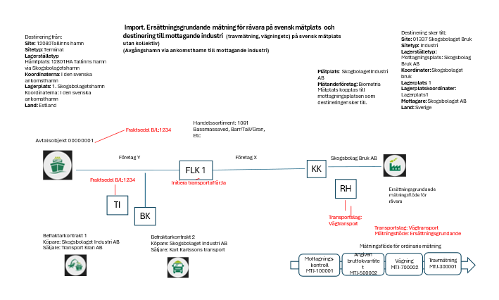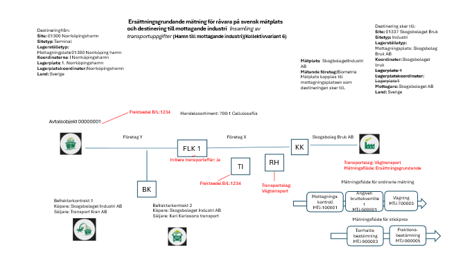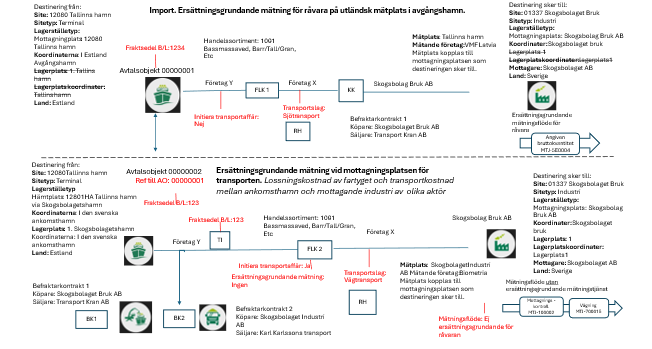 Import och ersättningsgrundande mätning för råvara och transport på svensk mätplats. Landet på avtalsobjektet påvisar import och det följer med från hämtplats, mottagningsplats i platsstrukturen.