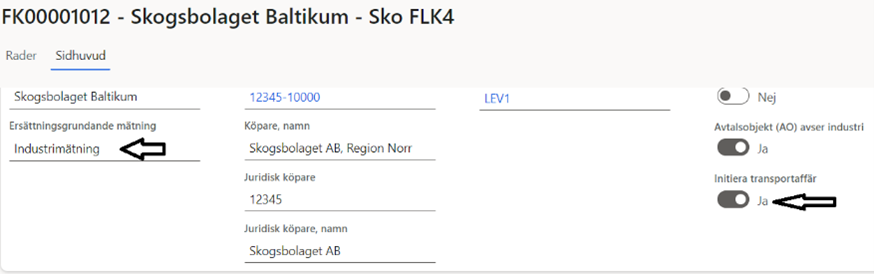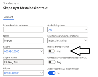 Du sätter upp ett förstaledskontrakt med ersättningsgrundanden mätning ”industrimätning” och initiera transportaffär ”Ja”. (Bild 1)