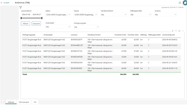 Avlämnat rapport 798 på Refererande Avtalsobjekt 00001230 visar ton kvantitet måttslagskvalitet 3.