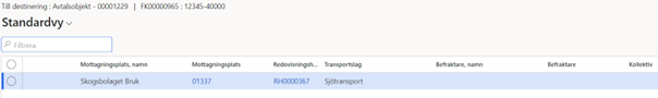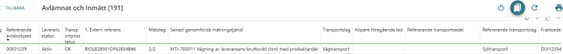 I rapporten avlämnat och inmätt 191 på fliken Sjö/Tåg/Väg-transport kan du se refererande avtalsobjekt, refererande transportslag och refererande transportsedel i kolumn (Bild 1) för att ge fler uppföljning möjligheter.