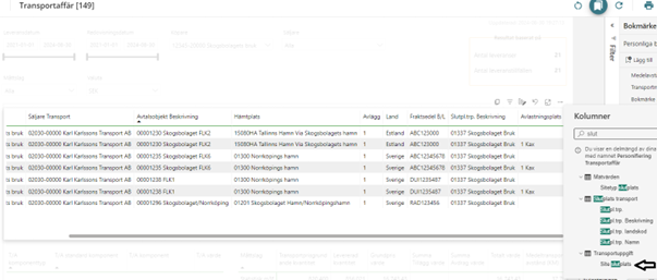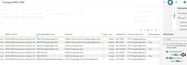 Site slutplats och Site startplats finns tillagt i rapporten. Hämtplats,B/L fraktsedel och landet på avtalsobjekt finns möjligheter att lägga in som kolumn i tabellen. (Bild 1 och 2) För att enkelt ska kunna följa upp.
