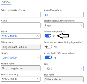 När du väljer initiera transportaffär ”nej” skapas inga befraktarunderlag eller transportinstruktionen. I chaufförsklienten eller mätplatsstödet (MPS) går det inte lämna transportuppgifter. Lämna transportuppgifter ”Ja” (bild 1) får du inte upp något avtalsobjekt. Det samlas inte in utförande företag eller registreringsnummer på bilar som syns i någon transportuppföljning.