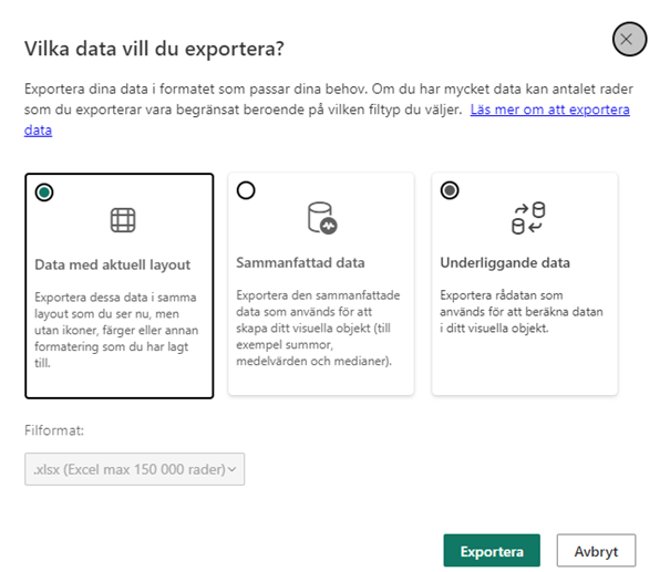 Följd fråga uppstår och Aktör kan välja hur man önskar exportera datat till Excel. Välj Exportera knappen efter val gjorts och filen blir nedladdningsbar i din dator.