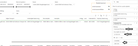 Finns det tecken i fraktsedel har du möjlighet att följa upp hur mycket kvantiteter och kostnader som är kopplad till en sjötransport och vilket land det kommer ifrån. Detta fungerar i de rapporter som har fraktsedel B/L och land på avtalsobjekt i filter.
