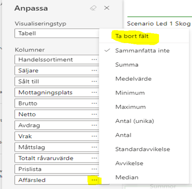 Fält kan också avlägsnas genom att markera de tre punkterna (…) och välj – Ta bort fält.