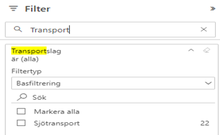 Sökbart är också om man önskar se enbart Sjötransporter i ett tidigt skede som filter. Bocka i sjötransport och enbart de leveranser som omfattas visas på Er behörighet.