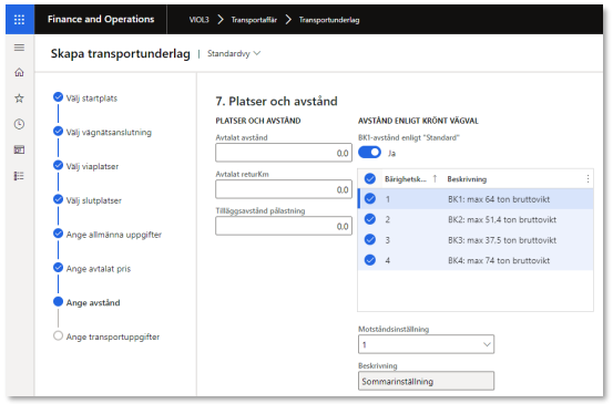 7. I detta steg anges avstånd eller förutsättningar för Krönt vägval att hämta avstånd. Det är möjligt att ange föjande avtalade avstånd, Tilläggsavstånd pålastning och Avtalat returKm. Det är också möjligt att ställa in vilka Krönt Vägval-avstånd som ska hämtas. Observera att för Krönt vägval är det endast möjligt att ange ett BK1-avstånd; Standard innebär att det är godkänt att hämta avstånd där start- och/eller slutplats ligger på en väg med lägre viktbegränsning än 64 ton (motsvarande BK1), exempelvis BK2 (51,4 ton). Om inte standard används kommer en strikt tolkning av viktbegränsning för BK 1 att göras och inga avstånd hämtas om inte hela sträckan kan köras med en BK 1-typbil. Avstånd kan hämtas för en eller flera typbilar. Hämtning kommer att ske baserat på de val som görs, för samtliga transportunderlag som skapas. Vilket avstånd som sedan används vid prisräkning styrs av avståndsprioritering i befraktarkontraktet.