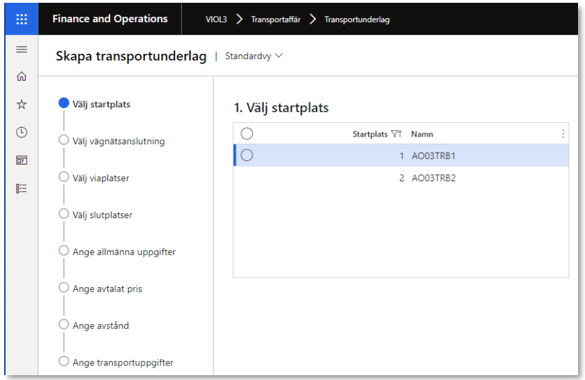 1. I steg ett i guiden visas samtliga möjliga startplatser för aktuell destinering. Markera en eller flera enligt hur många användarskapade transportunderlag som behöver skapas.