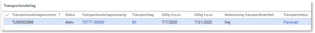 - Transportstatus. Sätts automatiskt till planerad vid skapandet av ett systemskapat transportunderlag, kan ändras till körklar och avslutad.