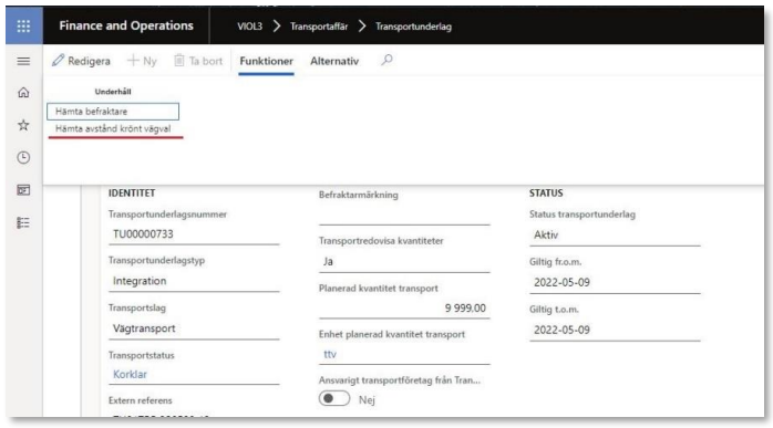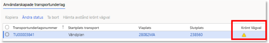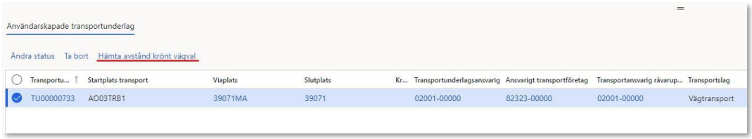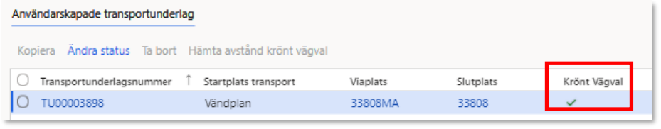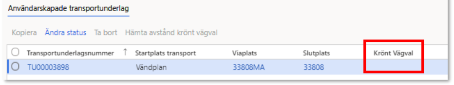 - När användarskapade transportunderlag skapats hämtas krönt vägvalavstånd för samtliga transportunderlag. Eftersom startplatser, viaplatser och slutplatser kan skilja sig åt kommer Krönt Vägval-avstånden att vara unika per användarskapat transportunderlag.