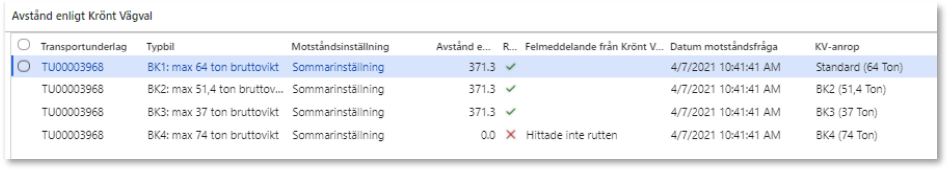 I kolumnen Krönt vägval på den nedre vyn med användarskapade transportunderlag finns fyra tolkningar att göra: