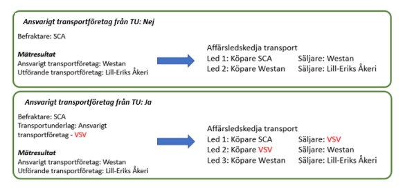 - Ansvarigt transportföretag från transportunderlag. Är en ja/nej funktion vars grundinställning på det systemskapade transportunderlaget hämtas från befraktarinställningar, men där inställningen kan ha uppdaterats vid skapandet av det användarskapade transportunderlaget. Funktionen innebär att om Ja är valt, kommer vid skapandet av affärsledskedja transport det alltid att anges med den aktör som är ansvarigt transportföretag från transportunderlaget. Om det är samma som anges i transportuppgifter vid mätning kommer ingen förändring från mätningens resultat att ske. Om det däremot skiljer sig ska ansvarigt transportföretag från transportunderlag läggas till i affärsledskedjan för transport och övriga i mätresultatet inrapporterade transportföretag förskjuts ett transportaffärsled, se figur nedan.