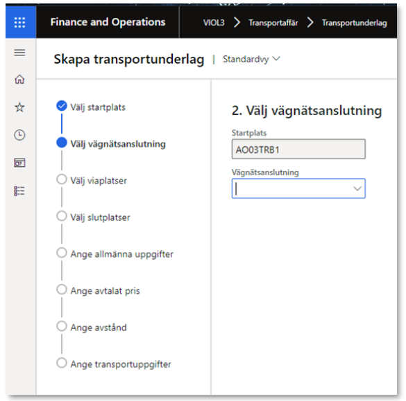 3. Efter att startplats och eventuella vägnätsanslutningar valts ska viaplats väljas, viaplats är just nu alltid en mätplats. Viaplats är inte obligatoriskt då en transport som går till en omlastningsplats inte alltid passerat en mätplats. De möjliga viaplatserna/mätplatserna visas i guiden. Observera att om transportunderlag skapas utan viaplats så kommer inte ett transportunderlag att hittas vid transportredovisning om viaplats anges vid mätningen.