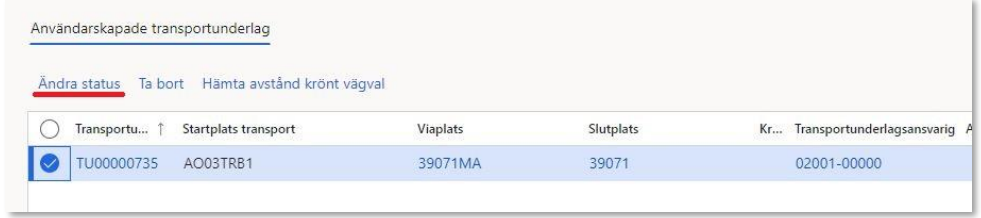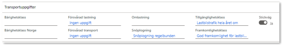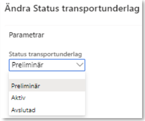 - Transportstatus. På det systemskapade transportunderlaget är status alltid planerad, finns även möjlighet att ange körklar eller avslutad.
