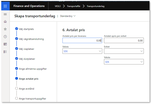 - Avtalat avstånd. Det är möjligt att ange ett avtalat avstånd som ska gälla för alla leveranser som uppfyller den startplats, viaplats och slutplats som finns på ett användarskapat transportunderlag. Det kan vara olämpligt att ange denna i guide då det avtalade avståndet gäller för samtliga transportunderlag som skapas.